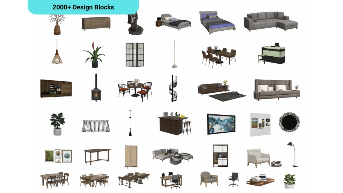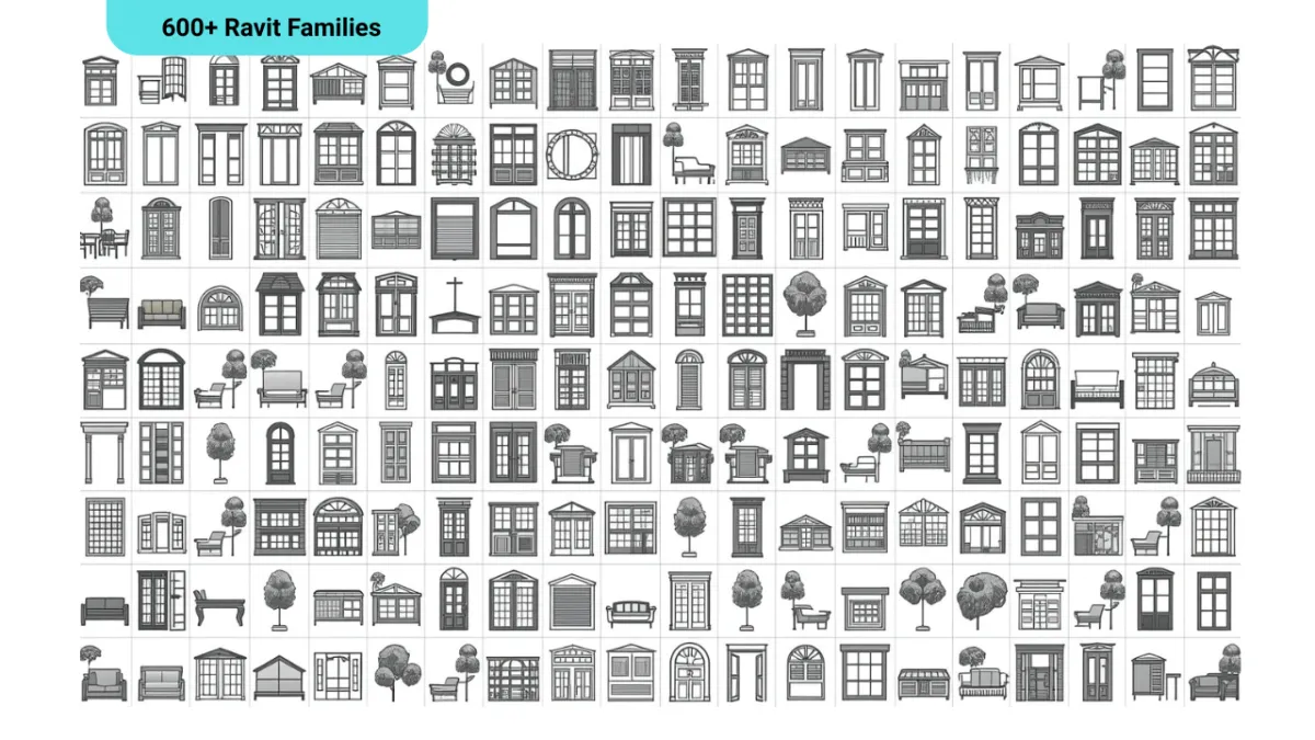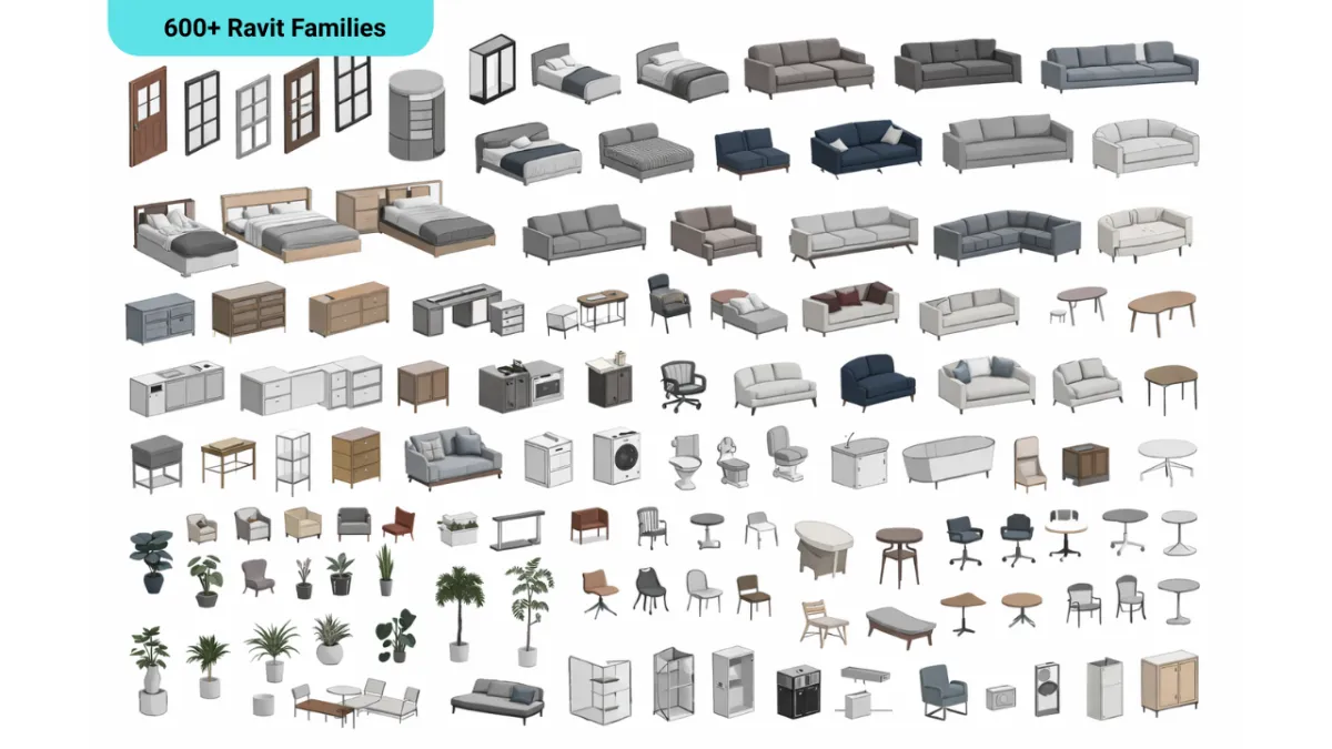 Parametric furniture, lighting, décor, fixtures, doors/windows, BIM symbols, and annotation elements.