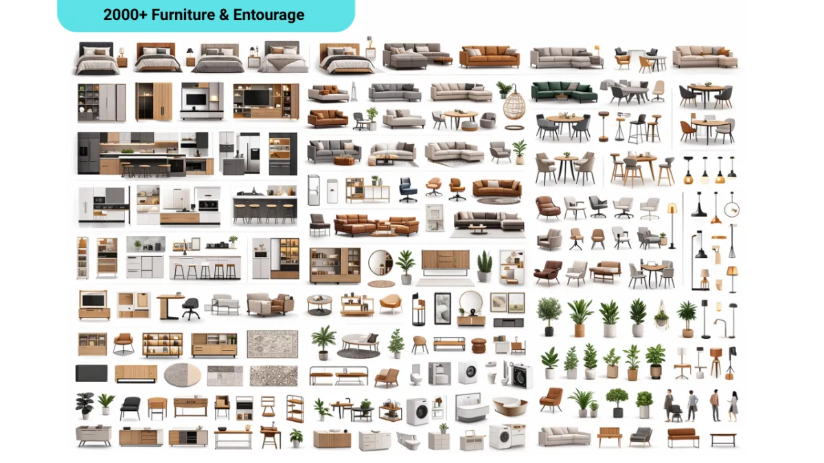 Ready-to-use furniture, plants, people, décor items, lighting setups, and scene assets.